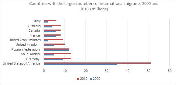 অভিবাসন বিষয়ক জাতিসংঘের প্রতিবেদন (জাতিসংঘ ২০১৯) নির্দেশ করে যে মার্কিন যুক্তরাষ্ট্র বিশ্বের মোট অভিবাসনের প্রায় ১৯ শতাংশের সমান আন্তর্জাতিক অভিবাসীদের (৫১ মিলিয়ন) সবচেয়ে উল্লেখযোগ্য সংখ্যক আয়োজন করছে। জার্মানি এবং সৌদি আরব অভিবাসীদের দ্বিতীয় এবং তৃতীয় বৃহত্তম সংখ্যা (প্রতিটি 13 মিলিয়ন) হোস্ট করে। 1990 এবং 2019 সালের মধ্যে, আন্তর্জাতিক অভিবাসীর সংখ্যা সৌদি আরবে 8.1 মিলিয়ন এবং সংযুক্ত আরব আমিরাতে 7.3 মিলিয়ন সঙ্গে বৃদ্ধি পেয়েছে।