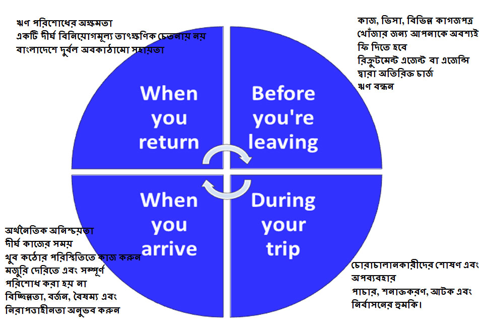 অভিবাসন চক্রের মধ্যে রয়েছে অভিবাসন প্রক্রিয়ার পর্যায়, কিছু ক্ষেত্রে, একটি রাষ্ট্রের মাধ্যমে ট্রানজিট, গন্তব্য অবস্থায় অভিবাসন এবং বাংলাদেশে ফিরে আসা।