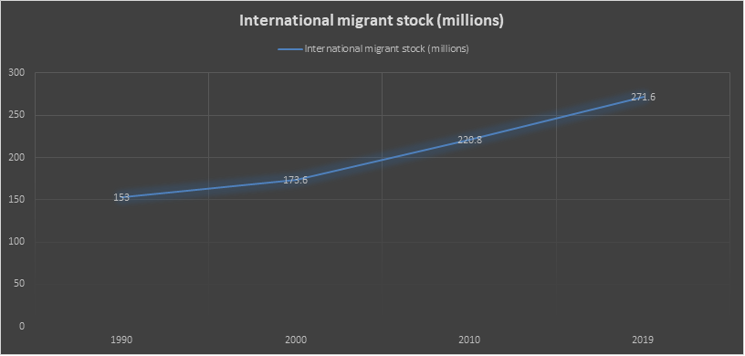 Дар байни солҳои 1990 ва 2019 шумораи муҳоҷирони байналмилалӣ дар саросари ҷаҳон тақрибан 119 миллион нафар афзоиш ёфтааст. Ин афзоиш аз соли 2005 суръат гирифт. Дар ҳоле, ки шумораи муҳоҷирони байналмилалӣ дар байни солҳои 1990 то 2005 тақрибан 39 миллион нафар, аз 153 миллион ба 192 миллион афзоиш ёфтааст, дар байни солҳои 2005 то 2019 тақрибан 80 миллион нафар афзоиш ёфтааст.