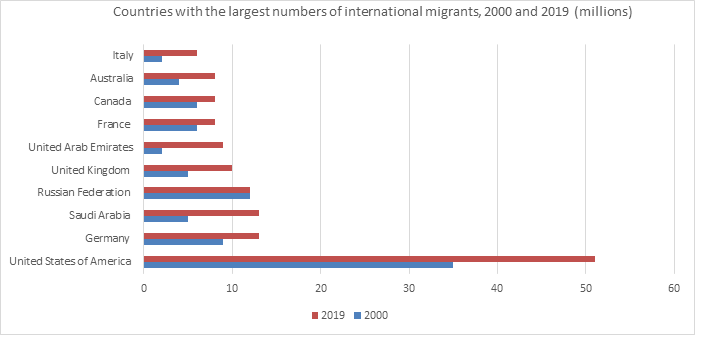 Гузориши Созмони Милали Муттаҳид дар бораи муҳоҷират (СММ, 2019) нишон медиҳад, ки Иёлоти Муттаҳидаи Амрико шумораи бештари муҳоҷирони байналмилалиро (51 миллион) мизбонӣ мекунад, ки тақрибан 19 фоизи шумораи умумии муҳоҷирони ҷаҳонро ташкил медиҳад. Олмон ва Арабистони Саудӣ аз рӯи шумораи муҳоҷирон (ҳар кадом 13 миллион) дар ҷойҳои дуюм ва сеюм қарор доранд. Дар байни солҳои 1990 ва 2019 шумораи муҳоҷирони байналмилалӣ аз 8,1 миллион дар Арабистони Саудӣ ба 7,3 миллион дар Аморати Муттаҳидаи Араб афзоиш ёфтааст.
