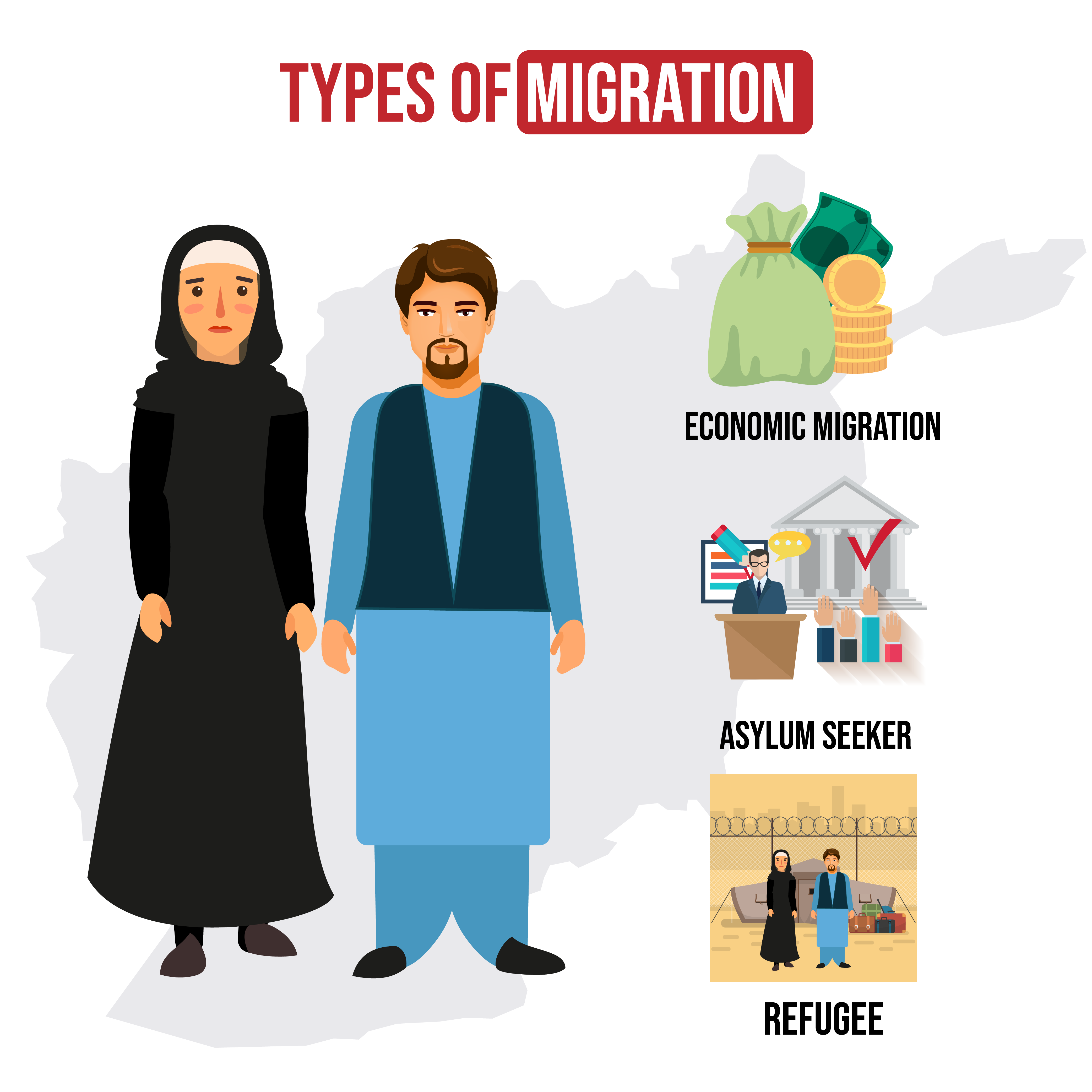 مردم به دلایل زیادی مهاجرت می کنند و انواع مهاجرت انسانها شامل موارد زیر میباشد: